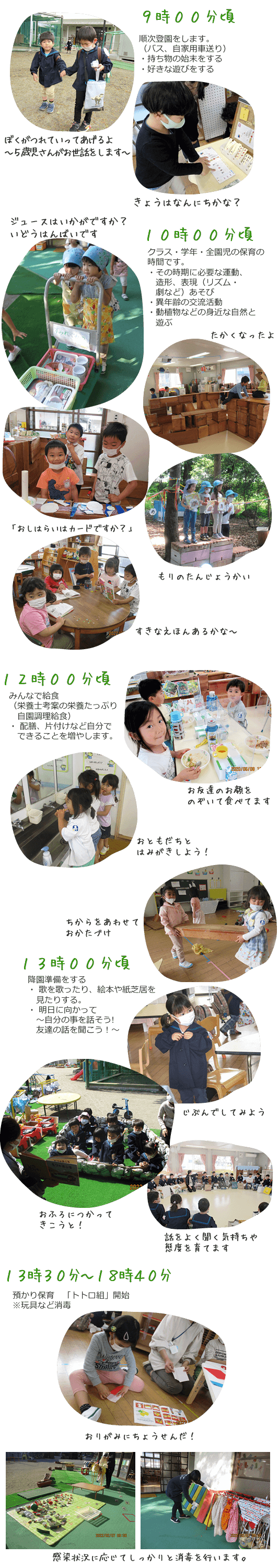 | 預かり保育 | 「トトロ組」 月・火・木・金 ・・・13時30分~18時40分 水曜日 ・・・11時30分~18時40分 第1または3土曜日(新2号・3号認定の園児対象) ・・・8時30分~12時30分 |